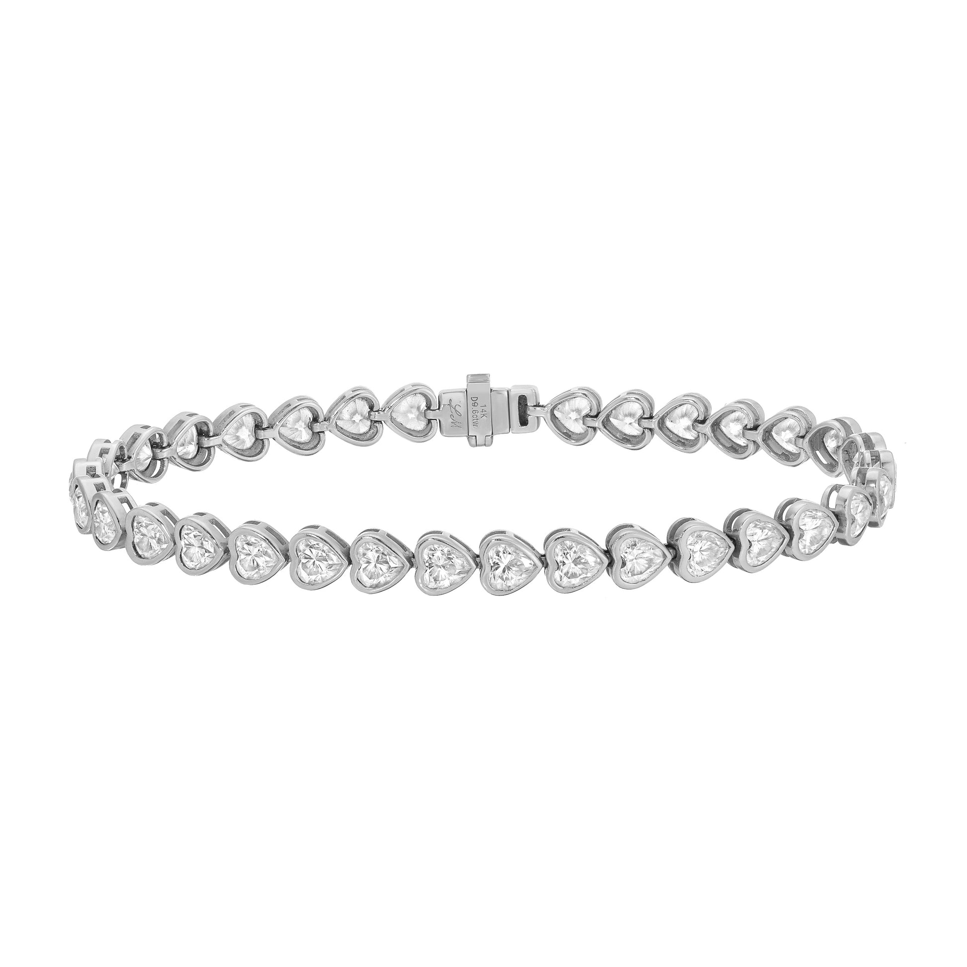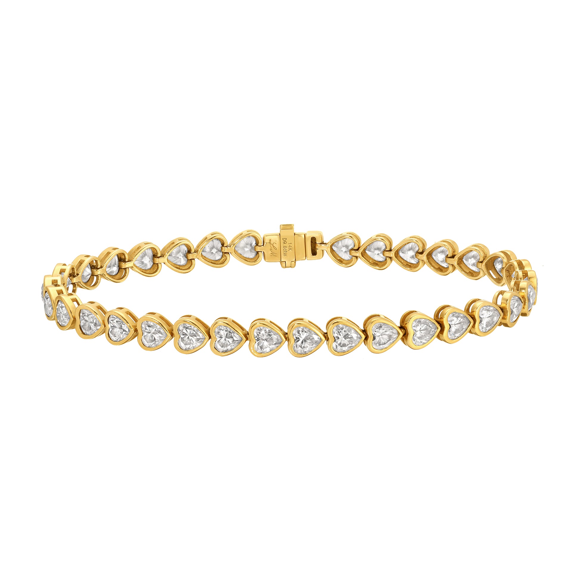 Each heart stone is 4mm. 9.6tcw. Available in 14K yellow, white or rose gold.